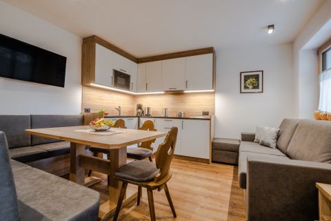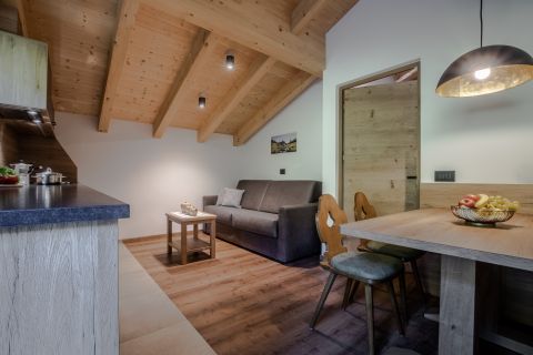 The flat Peció (spruce in Ladin) is located on the ground floor. It measures 72 sq m and can accommodate 2-6 people. It consists of 2 large triple rooms, each with private bathroom, living area with fully equipped kitchenette, table and satellite TV. In the bathroom there is a shower, bidet, toilet and hairdryer.